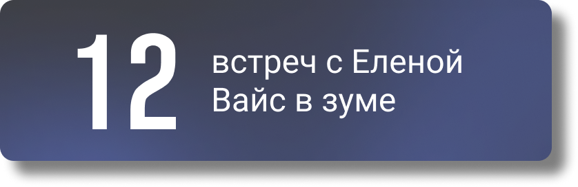 12 встреч в Зум с Еленой Вайс 1 практика распаковки истинных желаний 1 индивидуальный разбор вашего запроса с Еленой Вайс 9 разборов других участников в групповом поле в Зуме